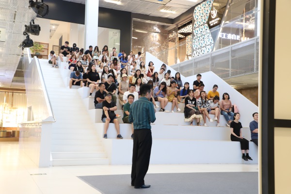 8月30日上午,來自山西傳媒學院環藝及新媒體專業的百多名學生來到藝展中心參觀,并在創意階梯聆聽來自設計師劉東風的講座。